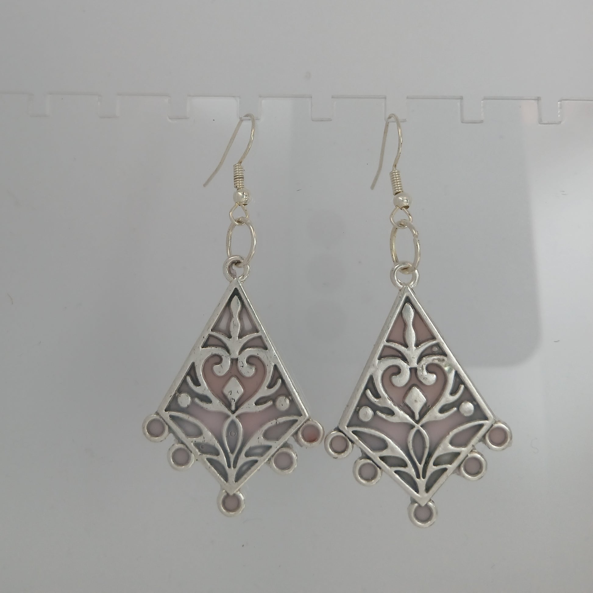 Metal diamond with filigree filled with resin. 3.5cm long by 3cm wide.
