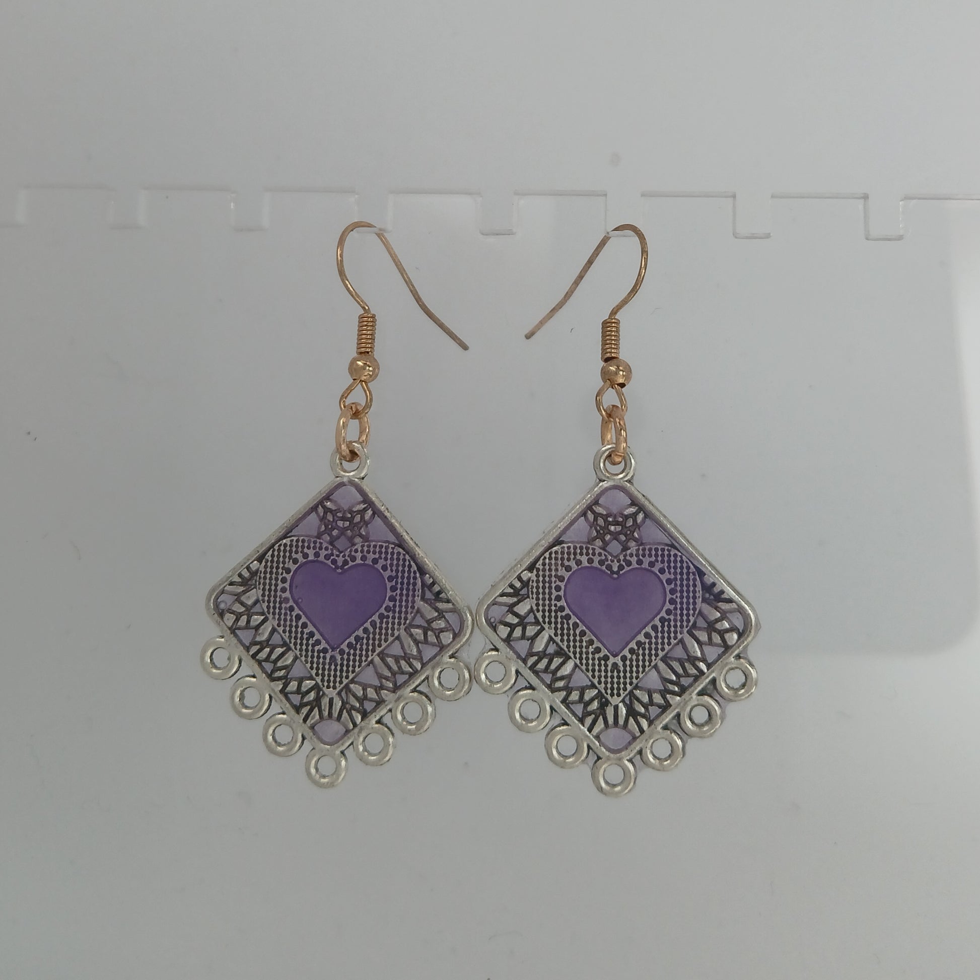 Metal diamond with heart filled with resin. 3cm long by 2.5cm wide.